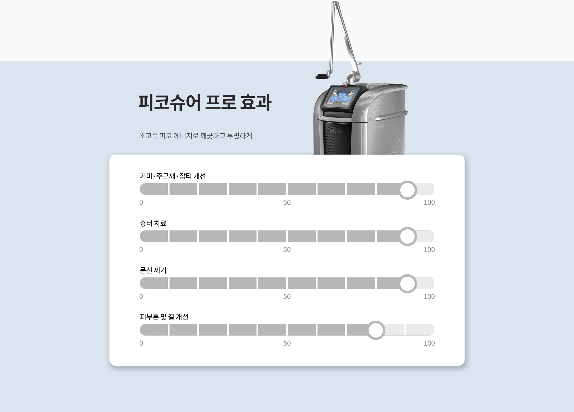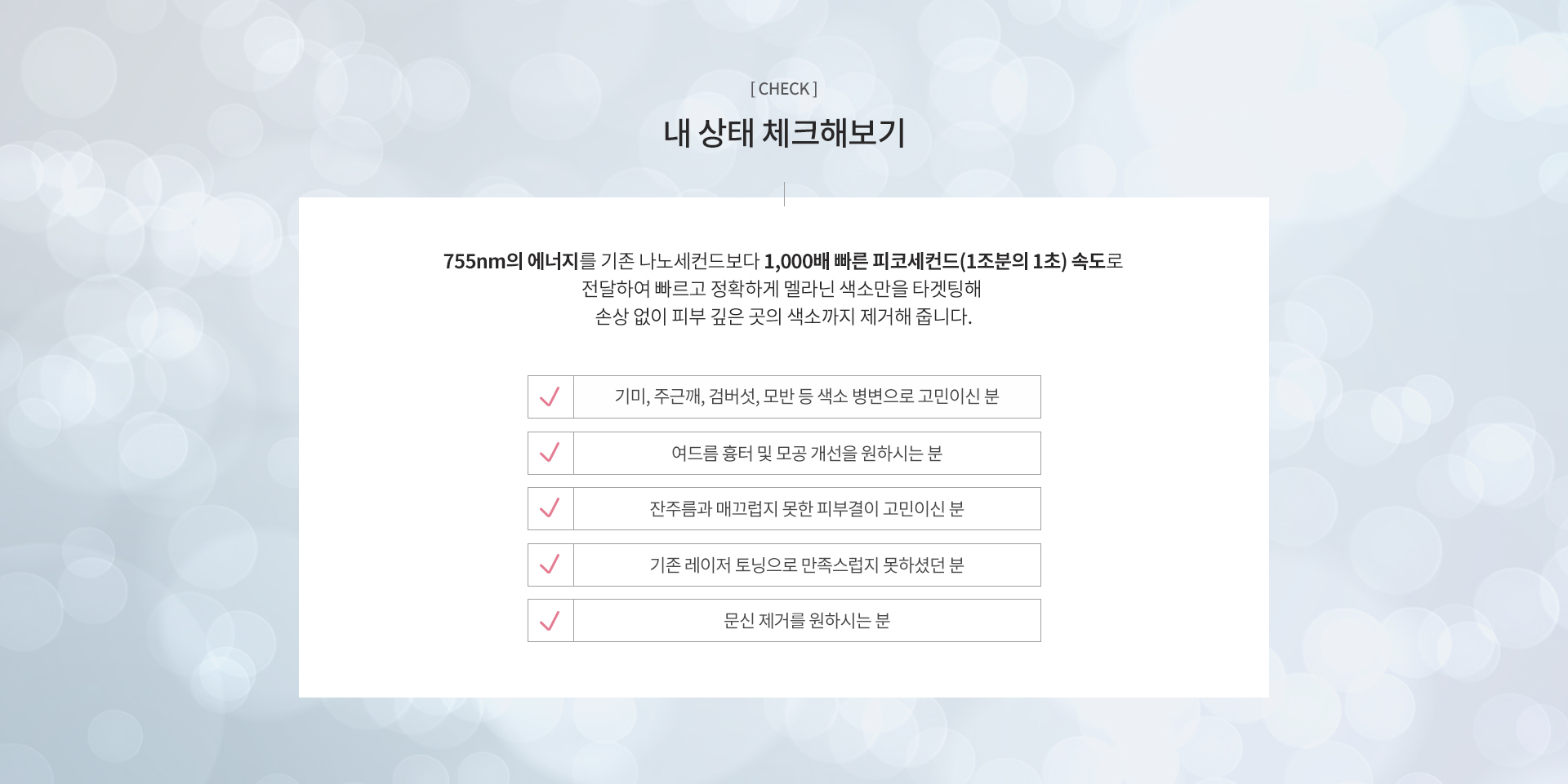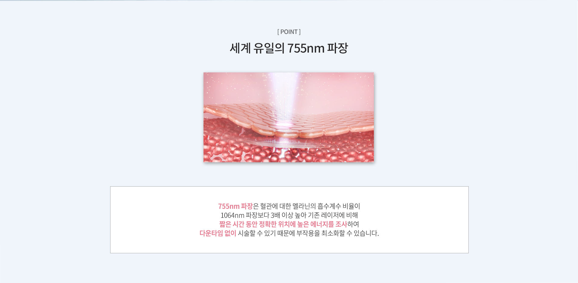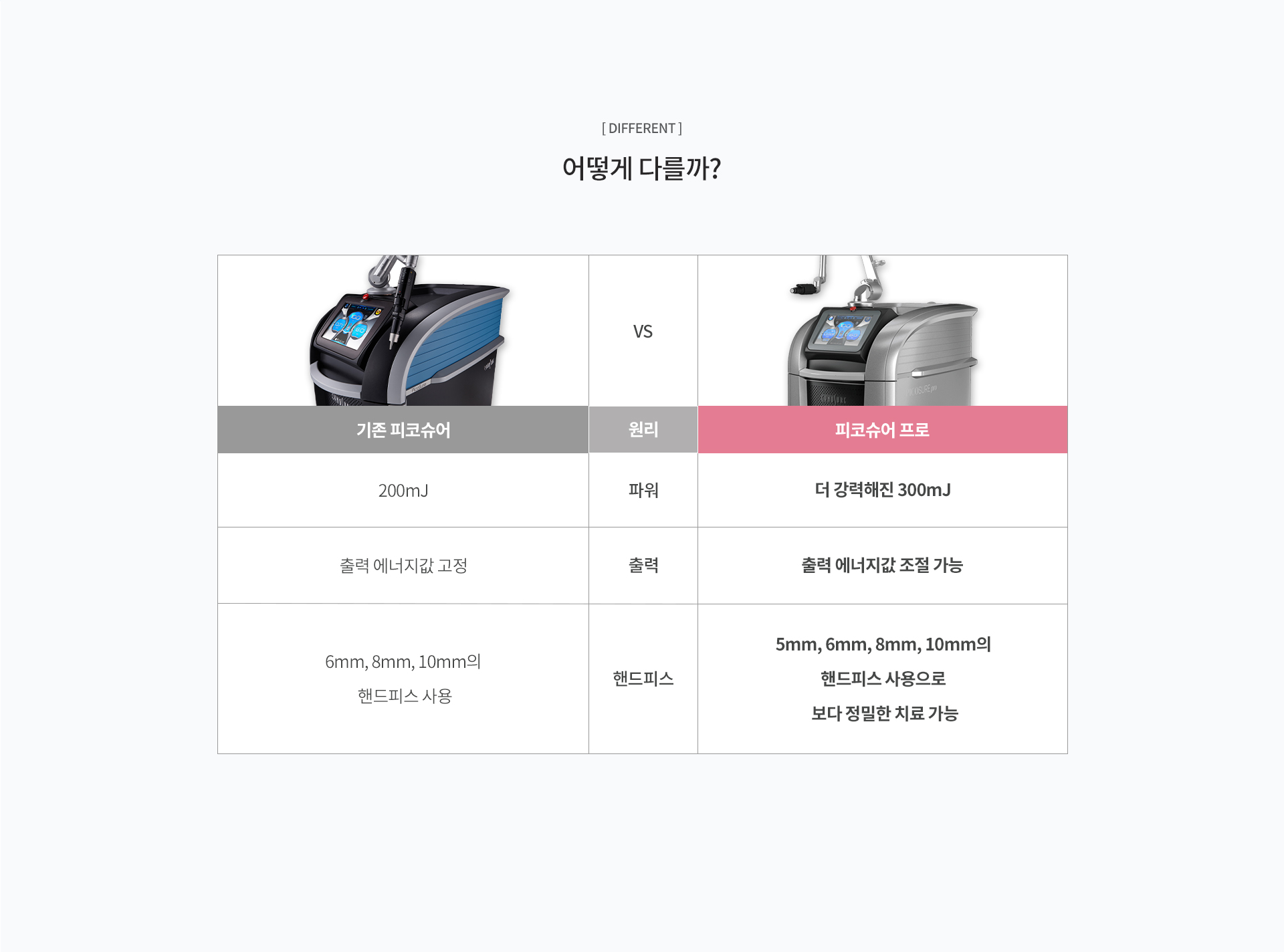 피코슈어프로는 755nm의 에너지를 기존 나노세컨드보다 1,000배 빠른 피코세컨드(1조분의 1초) 속도로 빠르고 정확하게 멜라닌 색소만을 타겟팅해 제거해 주는 시술입니다.